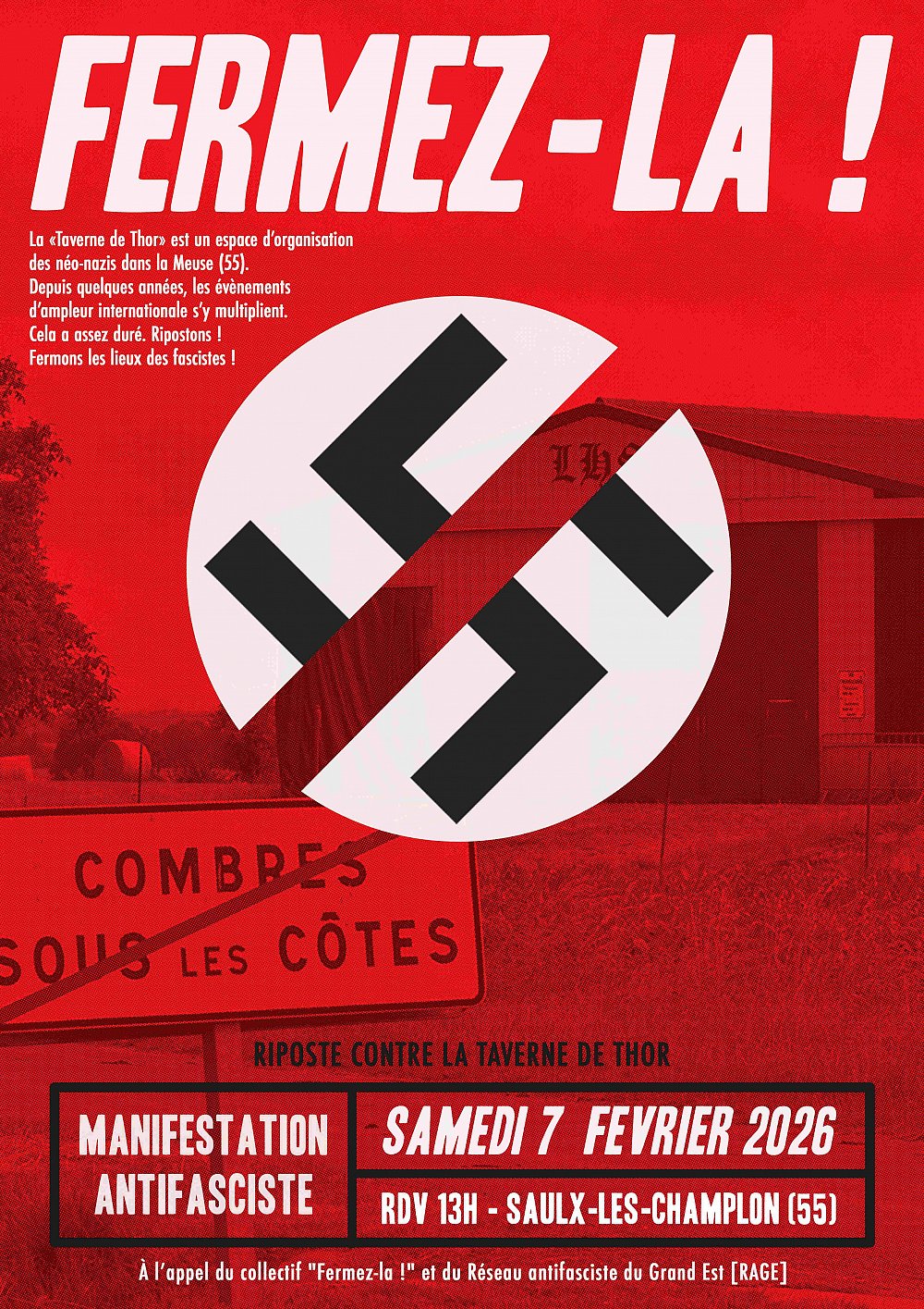 "Nous appelons à une manifestation antifasciste le samedi 7 février 2026 au départ de Saulx-lès-Champlon à 13h , au coeur de Meuse, contre le centre néonazis des Hammerskins, la taverne de Thor à Combres-sous-les-côtes. Nous voulons cette action de protestation déterminée et accessible à toutes celles et ceux qui s’opposent à l’implantation d’un réseau international néonazi dans le département et au-delà.